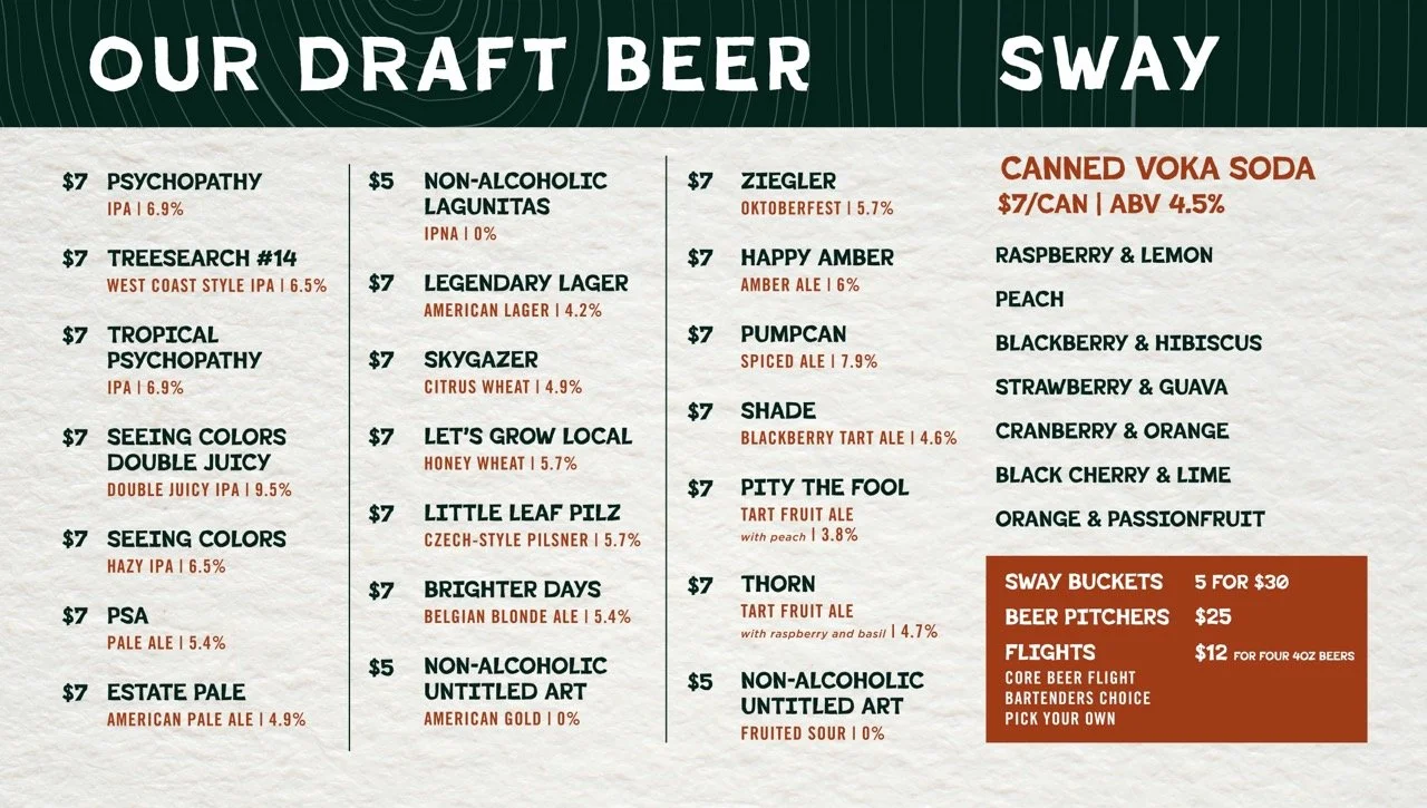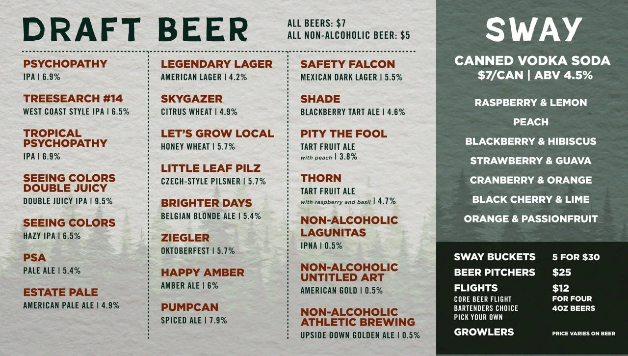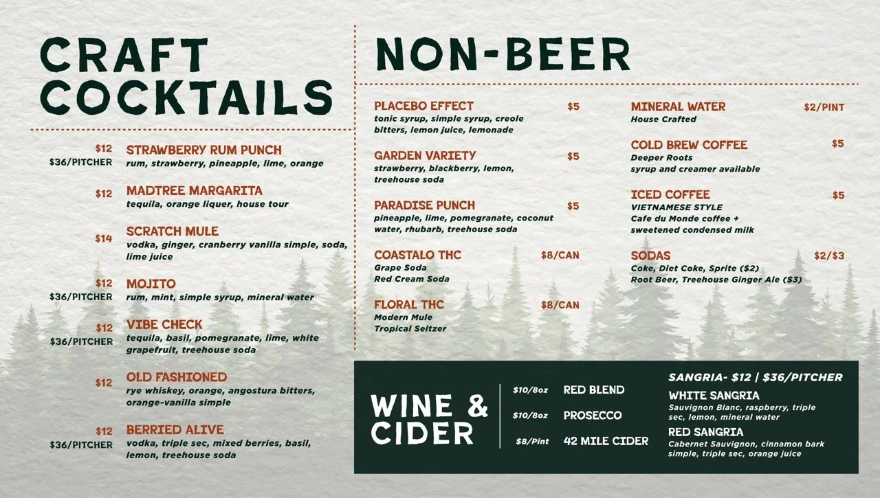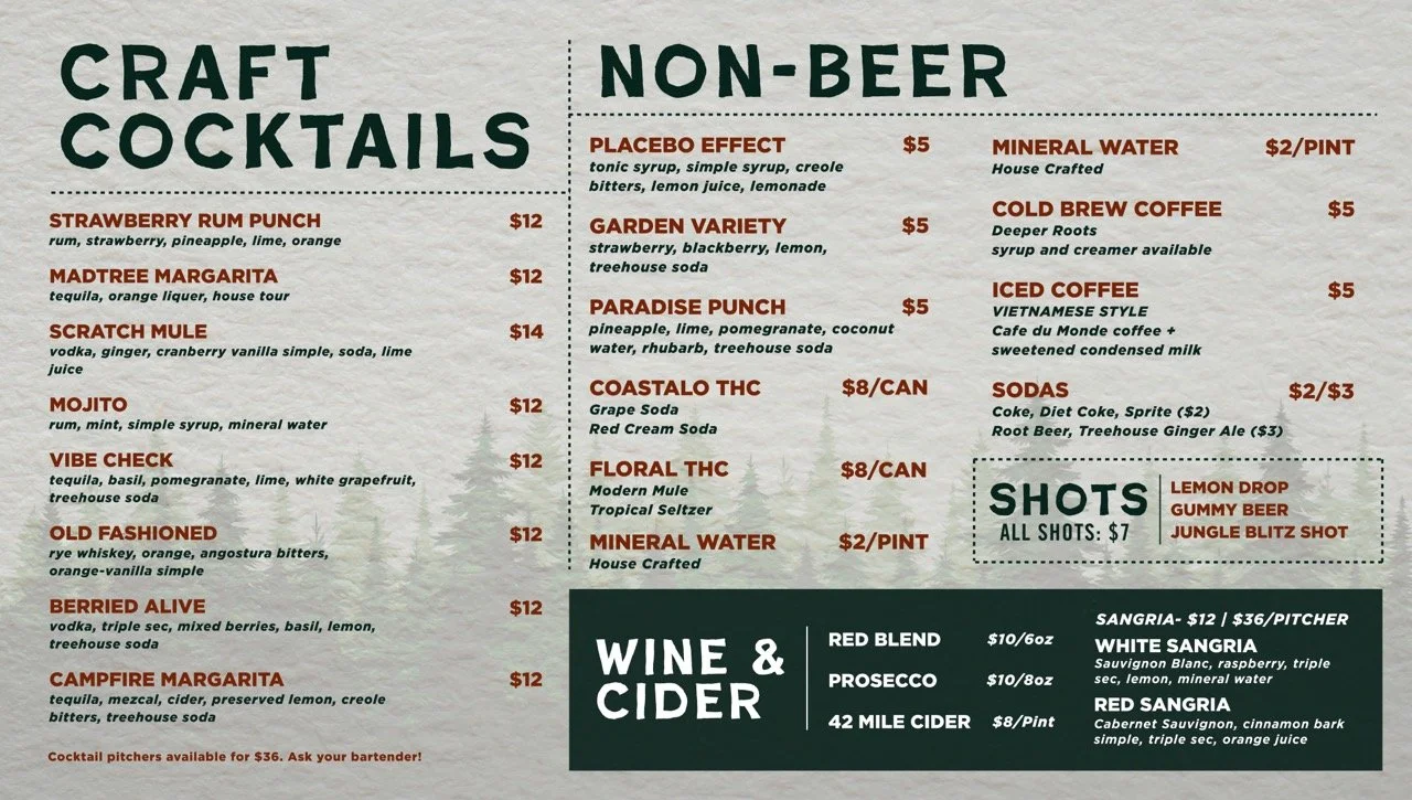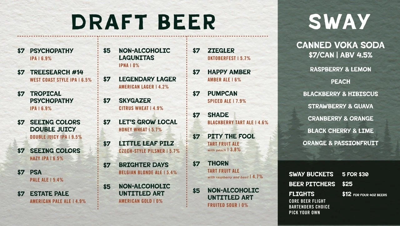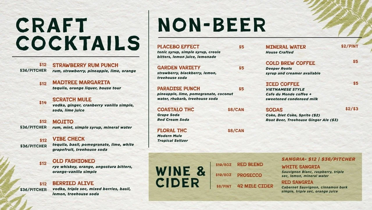 MadTree’s third location opened in Summit Park Blue Ash, Ohio, called Parks and Rec in 2025. It is very family friendly and reminiscent of a National Park visitor center. MadTree had locked down a logo, created by Cory Greiwe. However, the brand colors, patterns, and icons had not yet been locked down yet. This was exploration and ideation in an organic direction for the brand’s potential assets.
